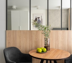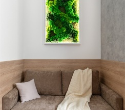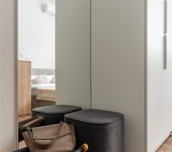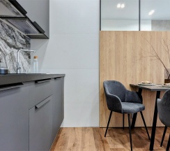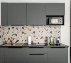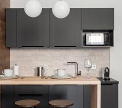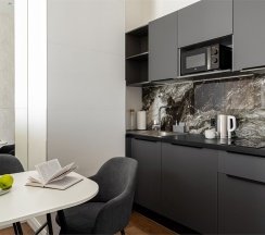2. Кухня со всем необходимым наполнением: двухкомфорочная индукционная плита, чайник, мини холодильник, набор столовой и кухонной посуды , микроволновая печь, капсульная кофемашина.