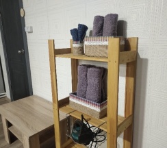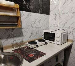 В номере есть все необходимое: микроволновка, холодильник, чайник, полотенца, вода, фен, шампуни, одноразовые зубные щетки и тапочки.