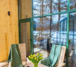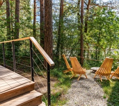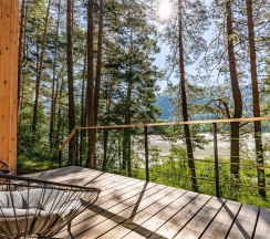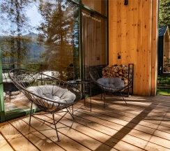 Проживание. Наши барнхаусы двухуровневые: с гостиной на первом и этаже и спальней на втором. Каждый день вас будет радовать великолепный вид из панорамных окон высотой 5 метров. Есть терраса с видом на горную реку и могучие алтайские горы. Отделка выполнена из эко-материалов.Инфраструктура. Для гостей Эко-отеля «Натура» доступна инфраструктура 5-звездочного отеля Grand Chalet Altay, который расположен в шаговой доступности.