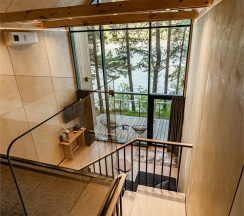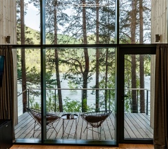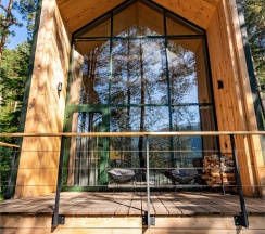 Эргономичное пространство барнхауса – идеально вписывается в окружающий ландшафт. В каждом доме, на первом этаже ты найдешь: просторную гостиную с комфортным диваном, телевизором и огромным панорамным окном, высотой в 2 этажа и функциональную ванную комнату с душевой кабиной со всеми необходимыми принадлежностями для комфортного проживания. На втором этаже располагается спальня с потрясающим панорамным видом на реку и горы. Просторная терраса дома отлично подходит как для живописного вечера на природе и утренней медитации. В Барнхаусе кровати только конфигурации полноценной двуспальной кровати размера King-size.