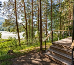 Отель стоит прямо на берегу могучей и бирюзовой Катуни, в сосновом лесу. Воздух волшебный! Территория очень ухоженная, зелёная и дышит спокойствием.