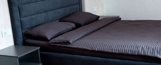 Две спальни, в каждой из них двухспальная кровать и раздвижное кресло, шкаф для одежды и прикроватные тумбочки. Есть утюг и гладильная доска.
