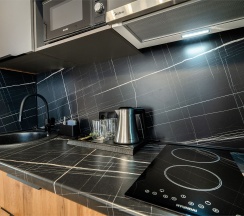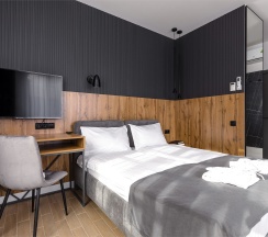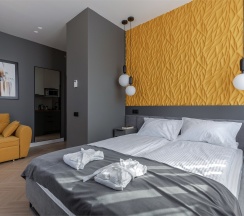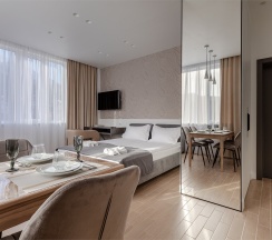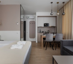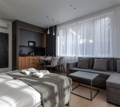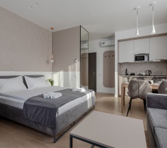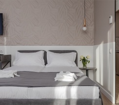 Уютные двухместные апартаменты. Дизайн номера выполнен в спокойных тонах. Площадь номера 22 кв м. В наших апартаментах есть все необходимое для комфортного отдыха, удобная кровать, полностью оборудованная кухня, комплект посуды, современная ванная комната, где вас ожидает комплект пушистых полотенец, тапочки и набор гигиенических принадлежностей.