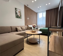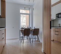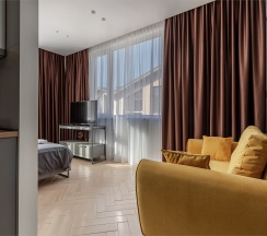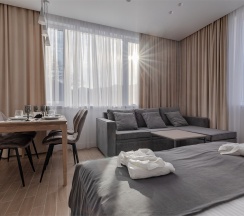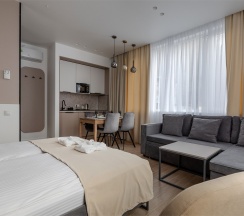 Просторные апартаменты подойдут для размещения 2-4 человек. Площадь номера 30 кв м. В наших апартаментах есть все необходимое для комфортного отдыха, удобная кровать и раздвижной диван, полностью оборудованная кухня, комплект посуды, обеденный стол и стулья, современная ванная комната, где вас ожидает комплект пушистых полотенец, тапочки и набор гигиенических принадлежностей.
