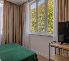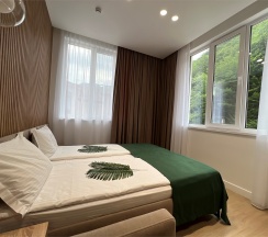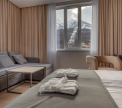 Просторные апартаменты с выделенной спальной зоной, а также балконом и видом на горы, подойдут для размещения 2-4 человек. Площадь номера 36 кв м. В наших апартаментах есть все необходимое для комфортного отдыха, удобная кровать и раздвижной диван, полностью оборудованная кухня, комплект посуды, обеденный стол и стулья, современная ванная комната, где вас ожидает комплект пушистых полотенец, тапочки и набор гигиенических принадлежностей.
