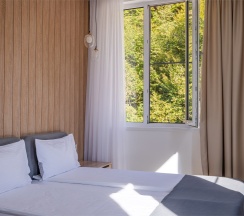 Кровати удобные, подушки комфортные. При открытом окне на свежем горном воздухе спалось великолепно. Отель находится позади от дорог, что очень прекрасно, нет шума от центральной оживленной улицы. В шаговой доступности остановка общественного транспорта, всевозможные магазины и кафе.
