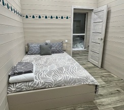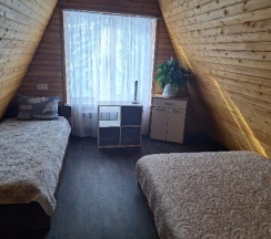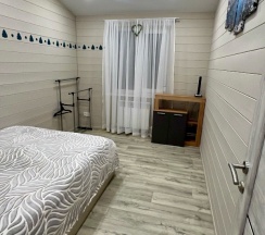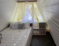 В доме 2 этажа. 1-этаж кухня-гостиная, сан. узел и большая входная группа для хранения инвентаря. 2-этаж основная спальня Максимальное количество проживающих - 2+1 (+1это доп. место на диване в кухне гостиной)