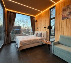 Дом «Панорама Лодж» с панорамным окном в размер стены. Это современный и стильный дом, построенный по австрийской технологии NATURI из вертикального бруса. Его площадь составляет 23 м2, а окна в комнате и кухне – панорамные, безрамные стеклопакеты с зеркальным напылением, которые полностью открывают вид на природу.
