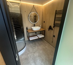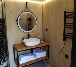 4.Баня. Печка и труба обложена камнями почти до потолка. Жар вообще огонь. Венечки, ковшик с длиной ручкой, шапочки и т.д. Даже ТУЛУП есть выйти покурить. В общем всё как надо. Деревянные ручки на двери и закрывается на магнитах. Реально баня-мечта!!!