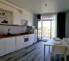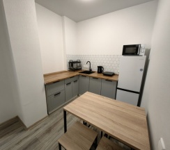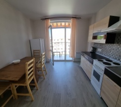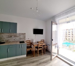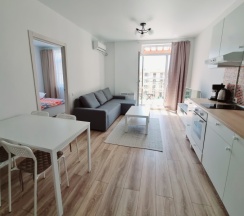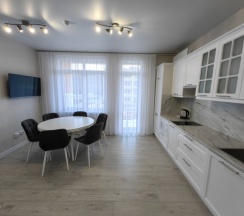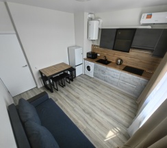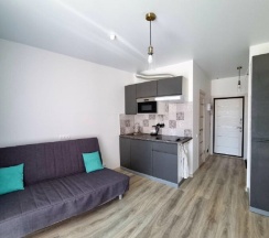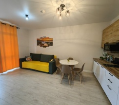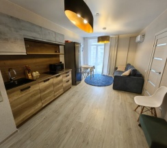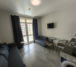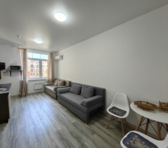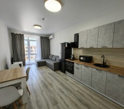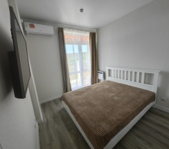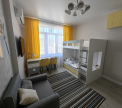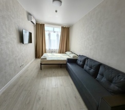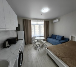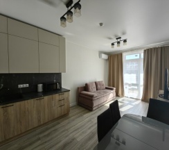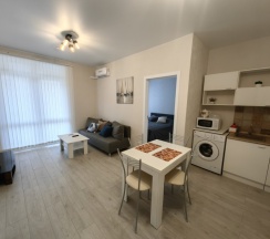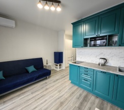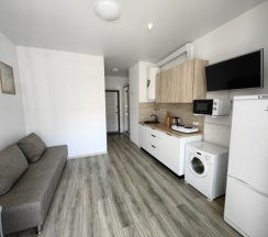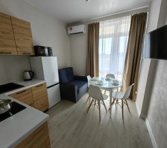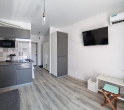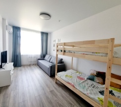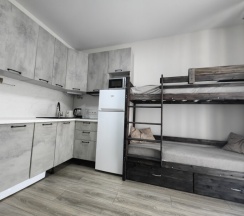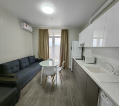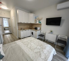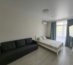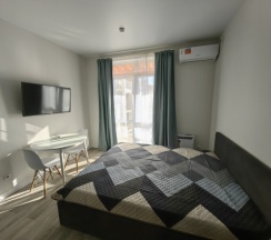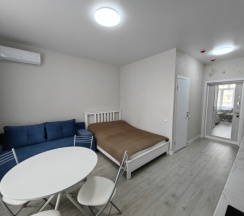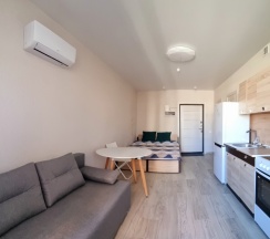 Площадь от 18 до 22 кв.м. Планировка – комната, совмещенная с кухней + ванная комната. В большинстве студий имеется меблированный балкон. Что касается спальных мест, есть студии, рассчитанные на проживание максимум трех гостей, – они оснащены двуспальными кроватями (диванами), по запросу предоставляется раскладушка. Также есть студии для четырех гостей – в них помимо двуспальных кровати (дивана) предусмотрены еще два спальных места (еще один диван или двухъярусная кровать).
