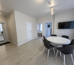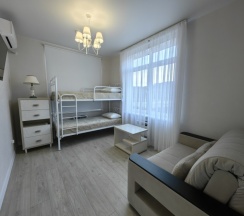 Что касается спальных мест, есть апартаменты, рассчитанные на проживание максимум трех гостей, – они оснащены двуспальными кроватями (диванами), по запросу предоставляется раскладушка. Также есть варианты для пяти гостей – в них помимо двуспальных кровати (дивана) предусмотрены еще два спальных места на кухне и раскладушка по запросу.