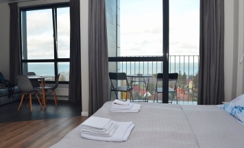 Апартаменты очень понравились, чисто, уютно, красиво, современно, панорамные окна и лоджия с прекрасным видом на море, здание находится в шаговой доступности к морю, озеру, вокзалу, центру города,