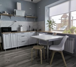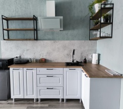 - Кухня со всей необходимой посудой, чайником, холодильником, микроволновкой, плитой;