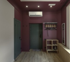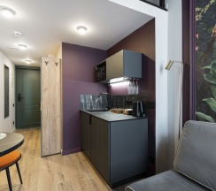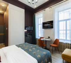 Мини-студия в современном стиле для размещения 1-2 гостей. Площадь номеров в категории от 10 до 14 м². Окна номера выходят в тихий дворик.