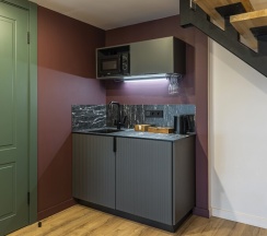 Уютная студия в стиле лофт для размещения 1-2 гостей. Площадь номеров в категории от 19 до 21 м². Все номера находятся на мансардном этаже. Высота до потолка в нижней части мансарды варьируется от 85 до 115 см, в верхней - до 245 см.