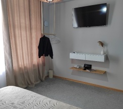 В гостинице 4 номера, очень тихо и уютно. Интересно и необычно, что есть общая кухня, можно приготовить еды, вся посуда имеется, обеденная зона на несколько столов, есть стиралка можно постирать вещи и есть общее место с диваном и проектом для отдыха. Расположение понравилось, совсем рядом море, новая набережная, пляж хорошо оборудован, чище и не такой многолюдный, как центральный, в пешей доступности рядом есть хорошие кафе и рестораны, озеро Ак-Гель, магазины рядом совсем. Мне такое расположение, понравилось намного больше, чем в центре, там шумно и суета. Гостиница очень понравилась, приеду обязательно ещё.