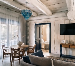 Жилая зона : двуспальная кровать, двуспальный диван, 2 прикроватные тумбы, кресло-качалка, журнальный столик, увлажнитель воздуха, телевизор Smart TV, Wi-Fi, гладильная станция, шкаф вещевой, торшер 2 шт, телефон для внутренней связи, сейф. Кухонная зона : холодильник с морозильной камерой, питьевая вода,чайная станция. Столовая посуда, столовые приборы, набор бокалов и стаканов, ножи для готовки, глубокие чашки из нержавеющей стали, штопор, разделочная доска, принадлежности для мытья посуды. Санузел с душевой кабиной, умный унитаз с функцией биде, подогревом сиденья и подсветкой, раковина. Набор полотенец, халат и тапочки (для каждого гостя). Мыло, гель для душа, шампунь для волос, кондиционер для волос, лосьон для тела. Зеркало, фен, теплый пол.