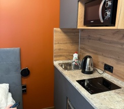 В номере есть все необходимое. Фен, микроволновка, чайник. Порадовала небольшая кухня. Заселение прошло достаточно быстро (были без брони) сам номер достаточно чистый и светлый