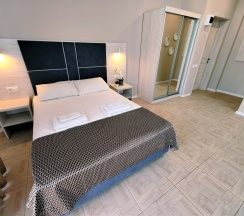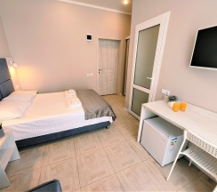 Номер оснащен: двуспальная кровать, прикроватные тумбочки, шкаф, туалетный столик, зеркало, сушилка телевизор, мини-холодильник.