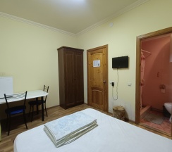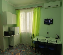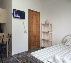 Студия 15 м2 с двуспальной кроватью и балконом с отдельным входом. Оснащена кондиционером, мини-холодильником, чайником, микроволновкой и ТВ. Ванная комната в номере.