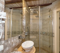Рустикальный номер отличается особой атмосферой благодаря использованию натуральных материалов, таких как дерево, камень и текстиль с грубой фактурой. Массивные балки и своды из натурального дерева напоминают средневековые деревенские мотивы и придают особую атмосферность данному номеру.