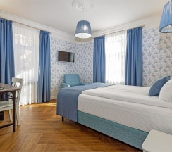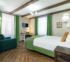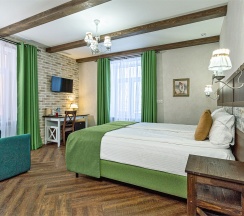 Отдыхали в начале марта в Международный женский день, номер оформлен под старину, но всё современное и функциональное, бронировали с сауной, обслуживание на высоте, в пожеланиях попросили включить сауну к определённому времени, всё было исполнено, отель новый, матрас ортопедический спали, как младенцы, завтрак не включён, но на кухне есть всё необходимое, включая кофемашину, а это редкость, рекомендую !!! Рядом через дорогу находится Преоратский дворец, магазины, всё в шаговой доступности.