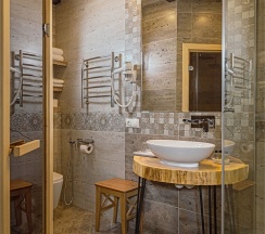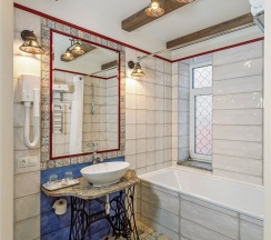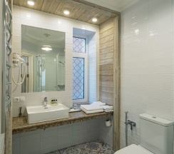 Номер в "Рустикальном" стиле находится на цокольном этаже и имеет 2 скошенных окна. Услуга "сауна" оплачивается отдельно от стоимости проживания по Вашему желанию.