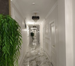 На первый взгляд с улицы — это здание супермаркета и как тут может быть отель?! Но поднимаясь на второй этаж встречаешь красивый холл в классическом стиле, с блестящим кафельным полом и красивыми люстрами и сомнения развеиваются.