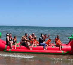 Утром 🏖️ 1км. На пляже есть все водные развлекательные катанья. Вполне по доступным ценам.