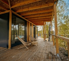 Отдельно стоящий двухкомнатный благоустроенный вариант размещения с большим панорамным окном в пол, санузлом и видом на лес и озеро.