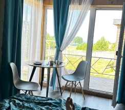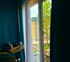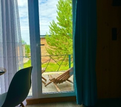 Райское место с вкуснейшим воздухом и необыкновенными видами! Панорамные окна, небольшая терраса, где можно любоваться закатом или пить кофе по утрам и загорать. В номере чисто и уютно, все необходимое для кухни, удобный матрас , телевизор, который вряд ли вам понадобится) На территории качели, гамаки на соснах, мангальная зона, баня. Приятное послевкусие и большое желание вернуться!
