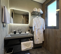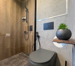 Домики построены из морских контейнеров, что тоже очень необычно, внутри красивый современный интерьер, есть всякие мелочи вроде посуды, косметики, фена….