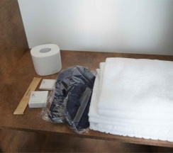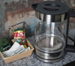 В комнате двуспальная кровать, сплит система, холодильник, чайник, электрический полотенцесушитель, мыло, шампунь, набор полотенец, тапочки, зубные щетки и пасты, расчески, наборы гигиенические и швейные, чай, кофе, сахар.