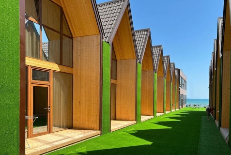 В комплексе расположены 43 современных коттеджа, рассчитанных на проживание 4–5 человек. Каждый коттедж — это двухэтажный, где гости могут наслаждаться свежим морским воздухом и расслабляться в комфортной обстановке. Предусмотрен душ и туалет, что обеспечивает удобство и комфорт для гостей. Второй этаж коттеджа предназначен для отдыха, здесь расположены уютные кровати, предоставляющие все условия для спокойного сна. Каждая деталь интерьера создана для того, чтобы гости чувствовали себя как дома.