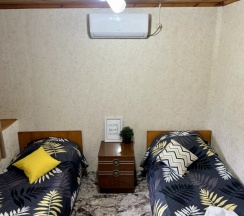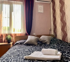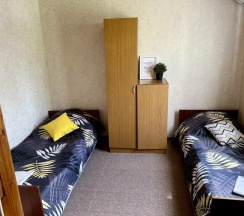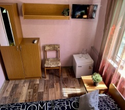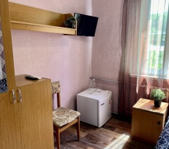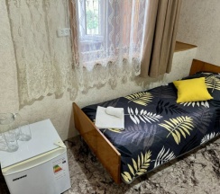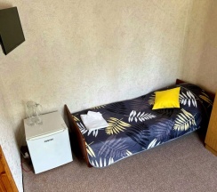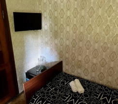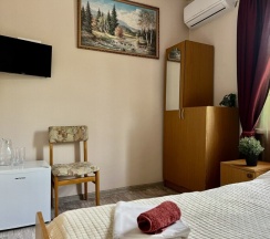 В номере есть всё необходимое: большая двуспальная кровать, шкаф, холодильник, кондиционер, телевизор, душ, туалет.