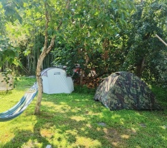 7 звёзд из пяти. Ехали проездом, очень устали и искали где кинуть палатку на огражденой территории. Вообще не ожидали, но это самый комфортный кемпинг из всех, которые я успела посетить. Во первых - ровная земля насаженная травкой, даже при условии, что мы забыли коврики - спать комфортно. Теперь о том, чего мы никак не ожидали от кемпинга - оборудованная чистая кухня с хорошей посудой (от гриль сковородок до красивых чашечек), холодильник, подвесные качели, гамаки, шезлонги, столики как на открытой поляне (под тентом) так и под крышей - там всегда прохладно, душевая и туалет - не био, не сельский, а обычный городской туалет и тоже очень чистый, помимо кухни и душевых ещё есть три умывальника на улице. Тут спокойно - ни шумных компаний, ни громкой музыки 🤍 Гостеприимные хозяева, красиво, цивилизованно, уютно - нам так понравилось, что остались тут на пару дней.