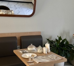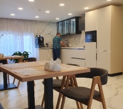 В кухне (больше похожа на стильное кафе) можно пользоваться всем необходимым для приготовления ужинов или обедов. Завтраки вкусные, мы выбрали яичницу и тосты. Блюда оформлены потрясающе.