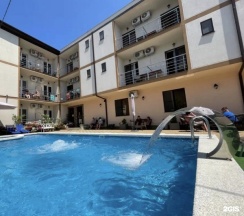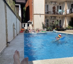 Были в августе. Уютный отель,ухоженная территория, симпатичный номер, шампунь и гель для душа, туалетная бумага и мусорные пакеты не рассчитаны на количество дней проживания, один день вода из душевой поднялась выше уровня и стояла на пороге номера. Небольшая детская площадка с обратной стороны здания, сбоку мангальная зона, у входа в отель хороший бассейн, удобная зона с зонтами, креслами и столиками возле бассейна, также шезлонги. Стоянка платная напротив или по той же улице. Рядом много магазинов и столовых, при том улица тихая! Из минусов расположения идти на море по короткой дороге мимо мусорных баков, которые неприятно пахнут, но есть и более длинный путь без запахов. Персонал, который слышит! Заехали в номер 2 взрослых и 2 детей, номер с односпальной и двухспальной кроватью, постельных принадлежностей положили на троих человек( наверно потому что номер заявлен как трехместный), по нашей просьбе выдали доп.подушку и простынь, хотелось бы, чтобы при заезде 4х человек учитывали этот факт предварительно сами работники. Чистая кухня с необходимым оборудованием и посудой. Удивило, что нет Комаров 😀 Минусы не испортили настроение! Желаю вам развиваться и процветать!