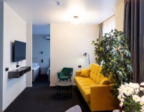 Очень уютная гостиница. Находится в центре, как я поняла. Доехали быстро, без всяких трудностей. В номере чисто, уютно, тепло. Туалет с душевой просторный. Есть фен, по 2 полотенца на гостя, гель+шампунь одноразовый, но нет зубной щётки и пасты. Есть чайник, холодильник. Номер просторный. По приезду обратно в город, с удовольствием ещё раз здесь остановимся.