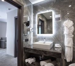 Просторный двухкомнатный номер с двуспальной кроватью 160*200 и диваном 160*200 В гостиной установлена сплит-система, телевизор и журнальный стол. Номер оборудован чайной станцией, кофемашиной и мини-баром, а также обеденным столом на 4 персоны. В спальне есть телевизор и письменный стол. Санузел включает ванну, гигиенический душ и полотенцесушитель, а также зеркало с подсветкой. В прихожей размещено зеркало в полный рост и большой шкаф для одежды. Из окна открывается вид на море.