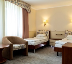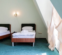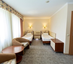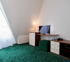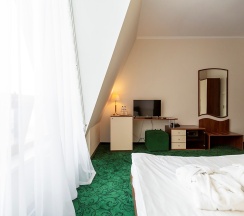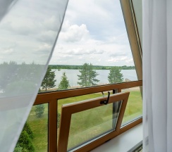 Номер с двумя раздельными кроватями удобный для проживания как во время деловых поездок, так и в рамках частных визитов. Окна номеров выходят на лес или Волгу.