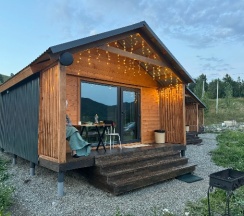 Отдыхали на прошлых выходных на этой базе. Шикарные, новые домики. Продумано все до мелочей, цветовая гамма, стиль. Есть все необходимое, шампунь, гель для душа (своё ничего не пригодилось), посуда. Из панорамного окна открывается прекрасный вид на горы.