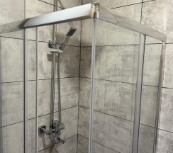 Теплые полы, место для хранения вещей, ЖК телевизор, современная душевая кабина и туалет,