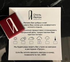 Хочу оставить отзыв о нашем отдыхе в отеле Акрон. Несомненно это лучший отель в Великом Новгороде. Премиум-сегмент. Отель, в котором все продумано до мелочей.