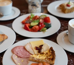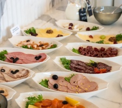 Завтраки в ресторане Проун при отеле Акрон начинаются с 7:30 и подаются в формате шведского стола и а-ля карт. Там действительно есть из чего выбрать: свежие овощи, фрукты, разные виды сыра и колбасы, вкусная выпечка и горячие блюда. Всё свежее и качественное, что ожидаешь от пятизвёздочного отеля.
