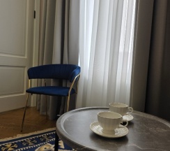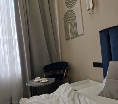 Номер и отель превосходные. Приятный и вежливый администратор, хорошая уборка номера, чисто и уютно. Удобное расположение с одной стороны недалеко ж.д.вокзал и море с другой центр города. Обстановка номеров, как на фото с сайта, очень высокие потолки, что создает дополнительный уровень комфорта, кондиционеры в каждой комнате, есть утюг, холодильник, посуда, в туалетной комнате мыло, шампунь, гель для душа, тапочки и халаты, все для удобства.