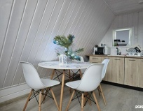 4км по щебенке и вы в пункте назначения. Домик а-фрейм уютный, горячая вода есть, душевая кабинка, унитаз, посуда чистая, техника исправна, но нет интернета под предлогом беспилотной опасности, но в это время у меня мобильный интернет был, хотя это не критично, я отдыхать приехал, интернет бы только мешал. На втором этаже кондер и матрац, по мне очень мягкий, но я выспался.