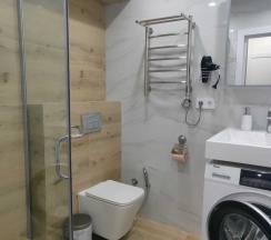 Ванная комната: раковина с зеркалом, унитаз, душ, стиральная машина, полотенцесушитель, фен.