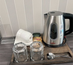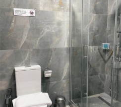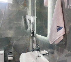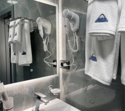 В номере гигиенические принадлежности, полотенца, халаты, чайные наборы, фен. В душевой комнате теплый пол и стена что позволяет высушить футболку/носки быстро.