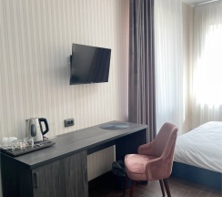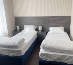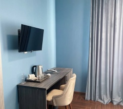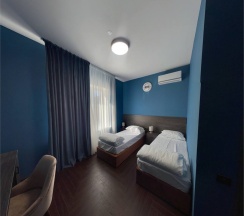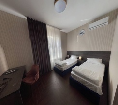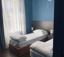 Номер с двумя раздельными кроватями. Кровати спринг-бокс при желании гостя могут быть соединены. В номере все условия для комфортного проживания гостей- мини-холодильник, рабочий стол, смарт-тв, журнальный столик, стулья, все банные и одноразовые гигиенические принадлежности. Номера все новые. Мы заботимся о здоровье наших гостей и поэтому проводим уборку дезсредствами и в помещениях периодически включаем облучатели-рециркуляторы воздуха. Каждое утро гости могут насладится бесплатным вкусным завтраком в формате-шведского стола. Вся городская инфраструктура находится рядом. Песчаный пляж и парк-аллея в пешей доступности от нас.